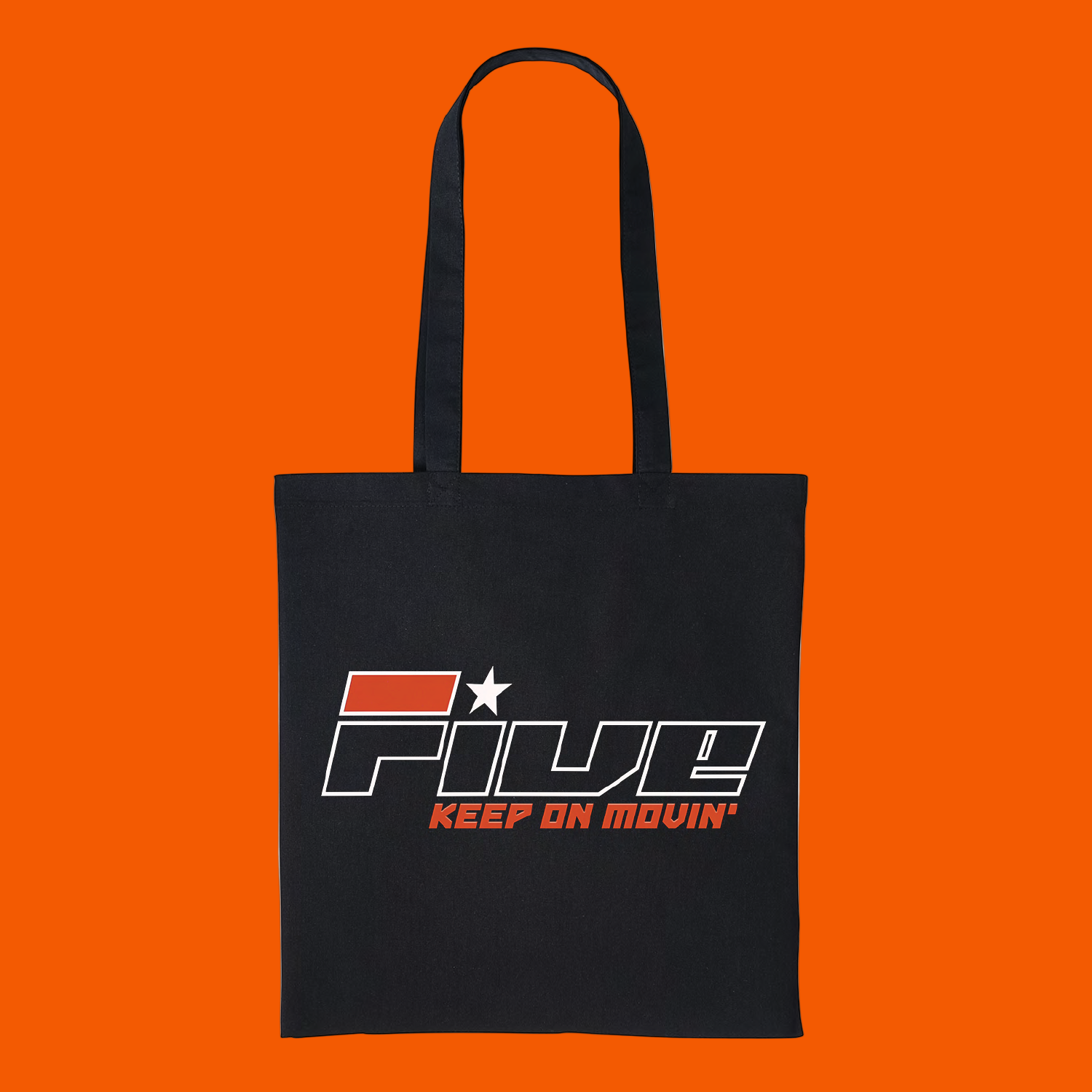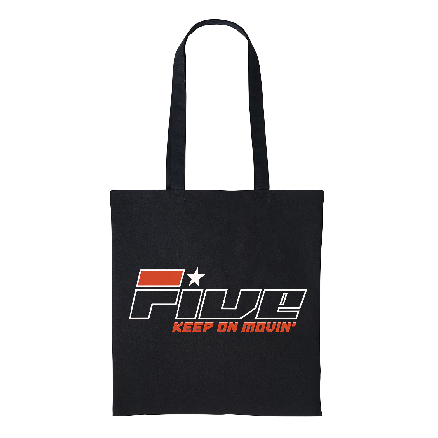Black cotton tote bag, featuring FIVE Keep on Movin' printed design.