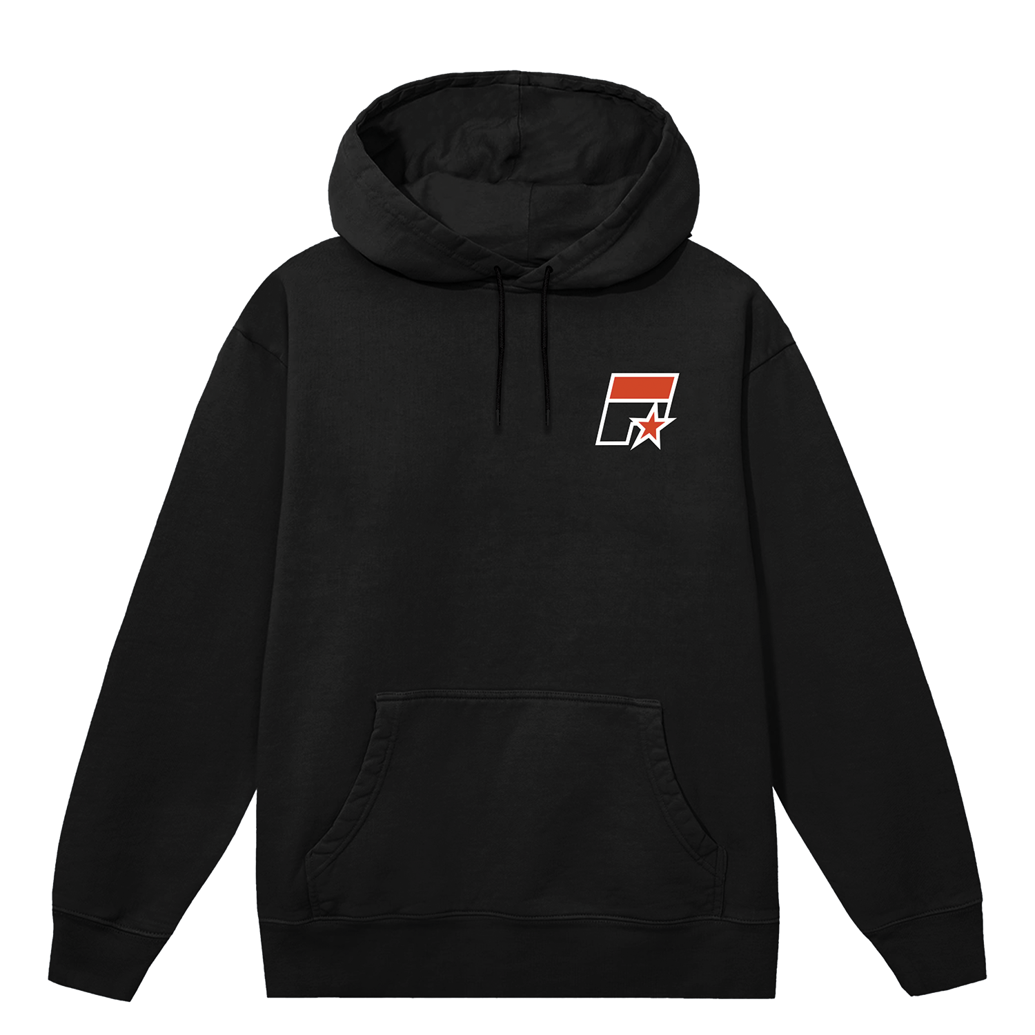 Black pullover unisex hoodie in a cotton and polyester mix. Featuring F-Star logo on the front and admat photo with tour cities on the back.